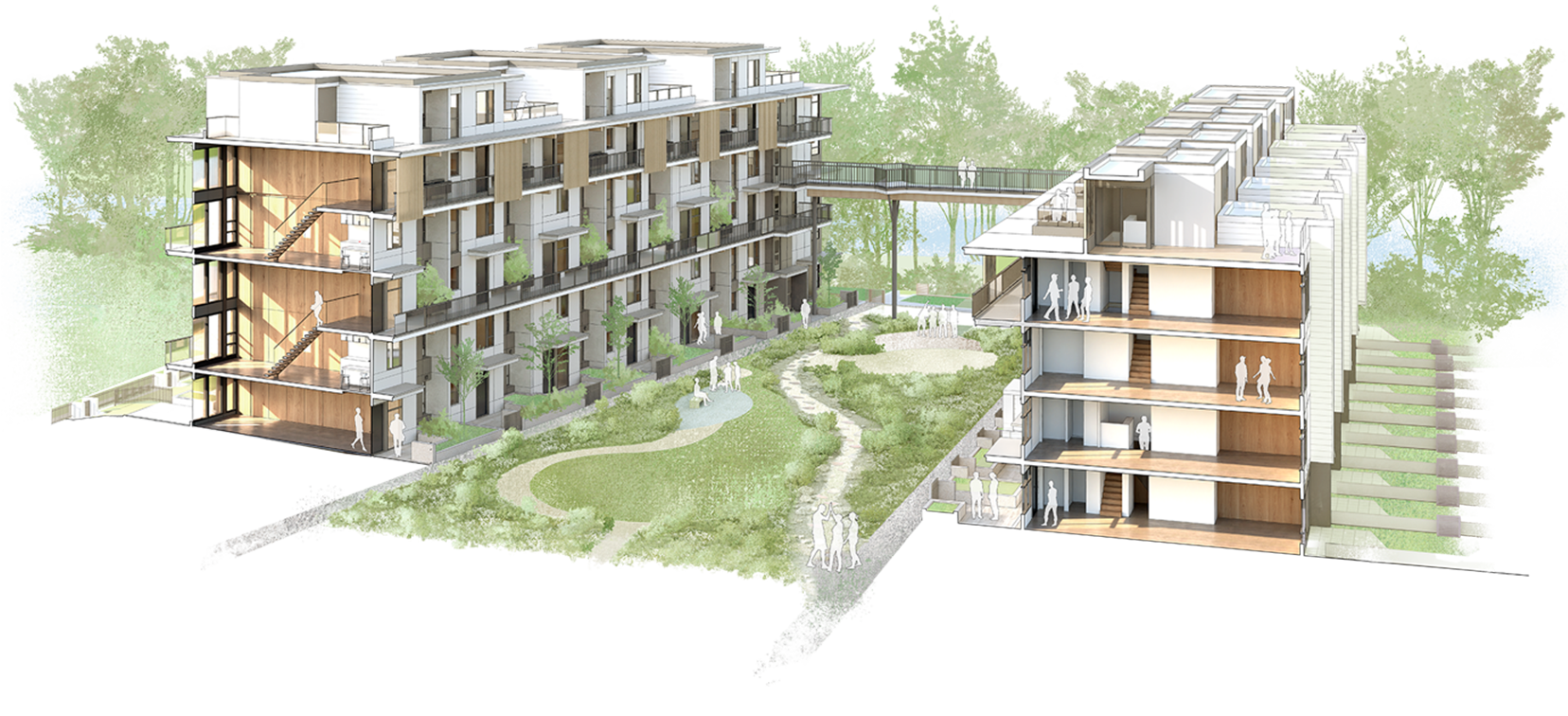 The heart of this community is green, with a vibrant central courtyard and views of the river.